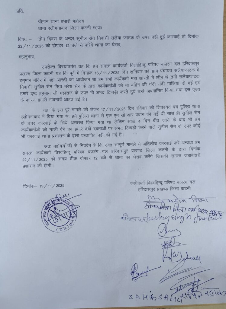 विश्व हिंदू परिषद बजरंग दल के कार्यकर्ताओं ने बताया कि सलैया फाटक निवासी सुनील सेन के द्वारा हम कार्यकर्ताओं को गाली गलौच हिंदू देवी देवताओं पर अभद्र टिप्पणी के कारण हमारी भावनाएं आहत हुई है पुलिस की कार्यप्रणाली भी हमारी समझ के परे है क्योंकि शिकायत के चार दिन बाद तक पुलिस ने कोई कार्यवाही नहीं की है यही कारण है कि इसके कारण स्लीमनाबाद थाना में अपराध का ग्राफ बढ़ता जा रहा है आज हम सभी कार्यकर्ताओं ने एक अल्टीमेटम सौंप कर सुनील सेन के ऊपर कार्यवाही की मांग की है कार्यवाही न होने की स्थिति में हम समस्त कार्यकर्ता दिनांक 22/11/2025 को दोपहर 12 बजे से थाना का घेराव करेंगे जिसकी समस्त जवाबदारी प्रशासन की होगी