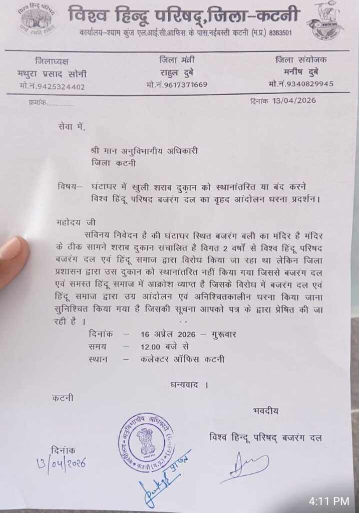 कटनी स्लीमनाबाद, विश्व हिंदू परिषद बजरंग दल के तत्वाधान में दिनांक 16/04/2026 गुरुवार को सुबह 11 बजे से अनिश्चितकालीन धरना एवं उग्र प्रदर्शन होगा ये आंदोलन शहर के बीचों बीच घंटाघर में हनुमान मंदिर के सामने स्थित शराब दुकान को लेकर होने जा रहा है विहिप बजरंग दल के कार्यकर्ताओं ने बताया कि इस शराब दुकान को लेकर प्रशासन को कई बार शिकायत पत्र दिए गए लेकिन आज दिनांक तक शराब दुकान नहीं हटी हमे सिर्फ और सिर्फ आश्वासन मिलता रहा है आखिर क्यों हमारी भावनाओं के साथ खेला जा रहा है मंदिर हमारी आस्था के प्रतीक है और इन्हीं आस्था के प्रतीकों के सामने शराब दुकान जैसे कृत्य संचालित हो रहे है जिसके कारण हमारी भावनाएं आहत हो रही है